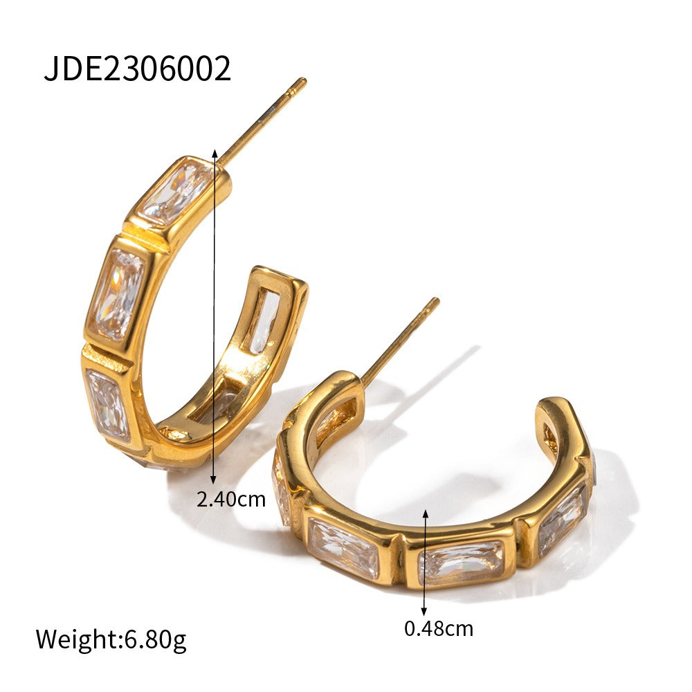 Elevate your elegance with the 18K Gold Stainless Steel Set with Zircon Earrings C-Shaped, designed for women who love high-end, sophisticated jewelry. Each pair of 18K Gold Stainless Steel Set with Zircon Earrings C-Shaped features sparkling zircon stones set in durable 18K gold stainless steel, ensuring long-lasting shine and non-fading beauty.