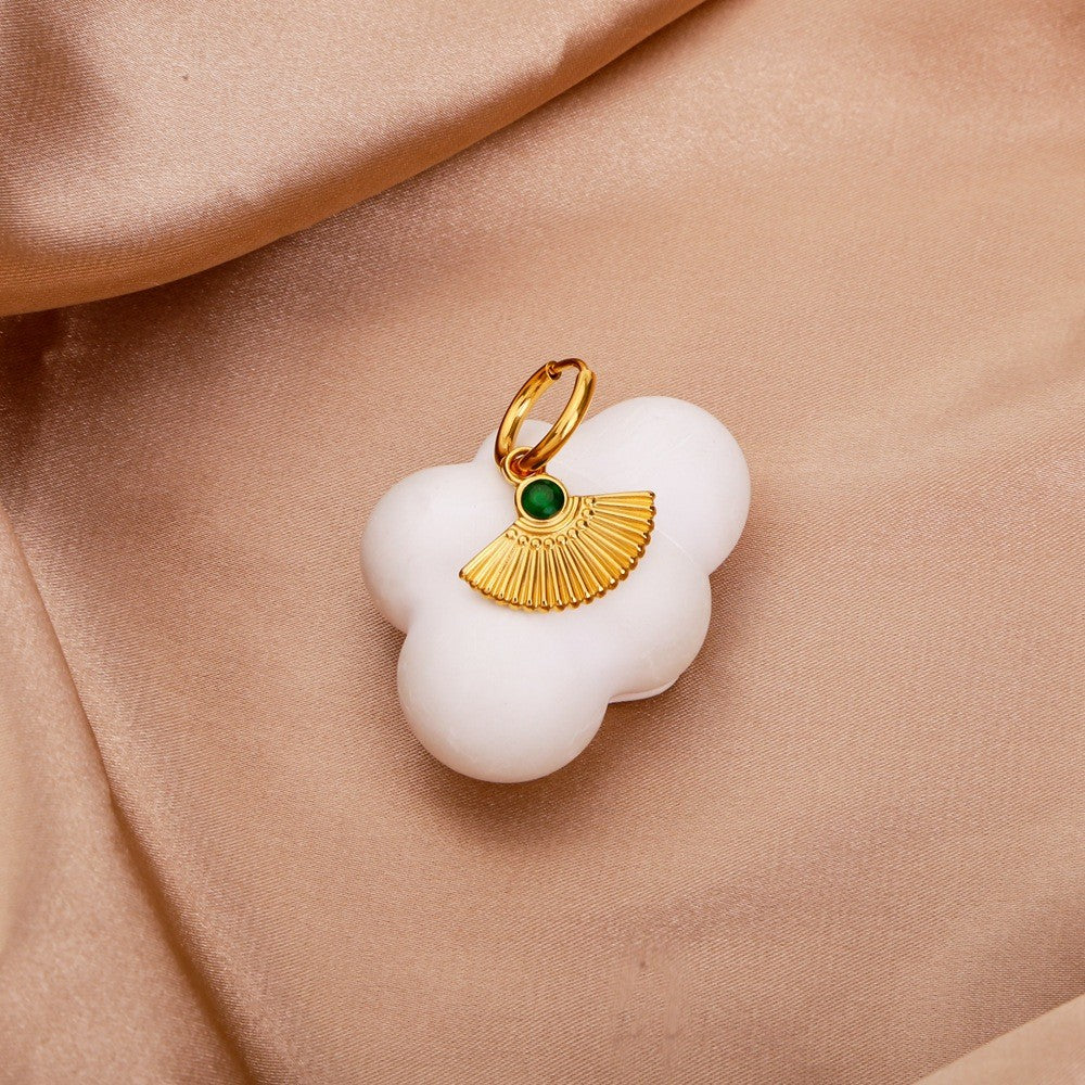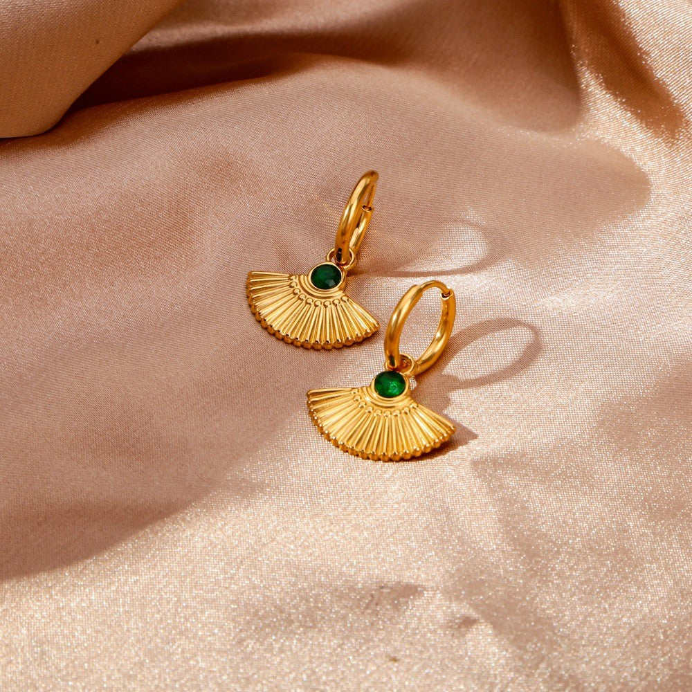 New Retro Round Green Zircon Fan Shaped Pendant Earrings – 18K Gold Stainless Steel Jewelry for Women