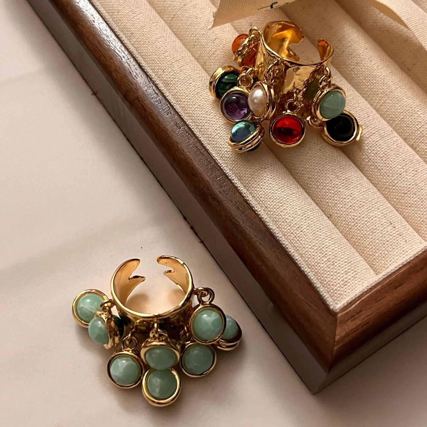 Perfect for weddings, parties, or elegant everyday wear, the Retro Court Natural Gemstone Peacock Stone Glass Multi Pendant High-End Tassel Open Ring adds sophistication to any outfit. The adjustable open design ensures a comfortable fit, while the exquisite craftsmanship highlights its high-end appeal.